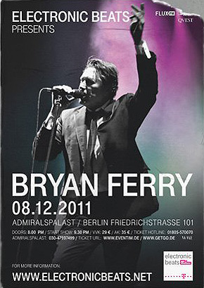 Bryan Ferry will perform in Berlin at Admiralpalast on December the 8th, 2011. Previous concerts have included genre defining acts such as Yello and Donna Summer. BUY TICKETS NOW MORE INFORMATION: www.electronicbeats.net Also appearing in London, UK on December 14th and 15th. SHEPHERD’S BUSH EMIPRE