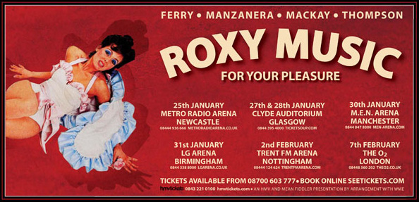 Bryan Ferry will be leading ROXY MUSIC on tour for 2011. The band line-up will include guitarist Phil Manzanera, saxophonist Andy Mackay and the great Paul Thompson on drums. Dates are confirmed for the UK, Australia and New Zealand. ROXY MUSIC 2011 ‘FOR YOUR PLEASURE’ TOUR UK, AUSTRALIA, NEW…