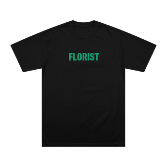 Black t-shirt with 'Florist' text in green on the front.