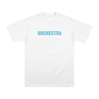 White t-shirt with 'Orchestra' text in blue on the front.