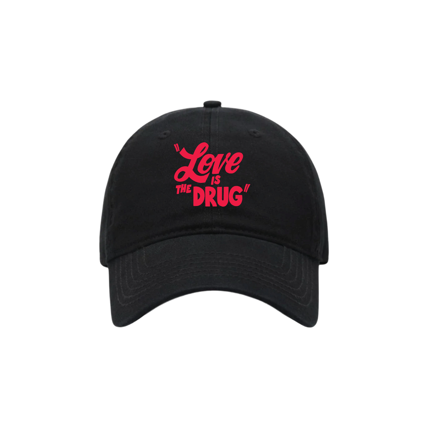 Limited edition 'Love Is The Drug' black cap, featuring embroidered graphic logo design in red.