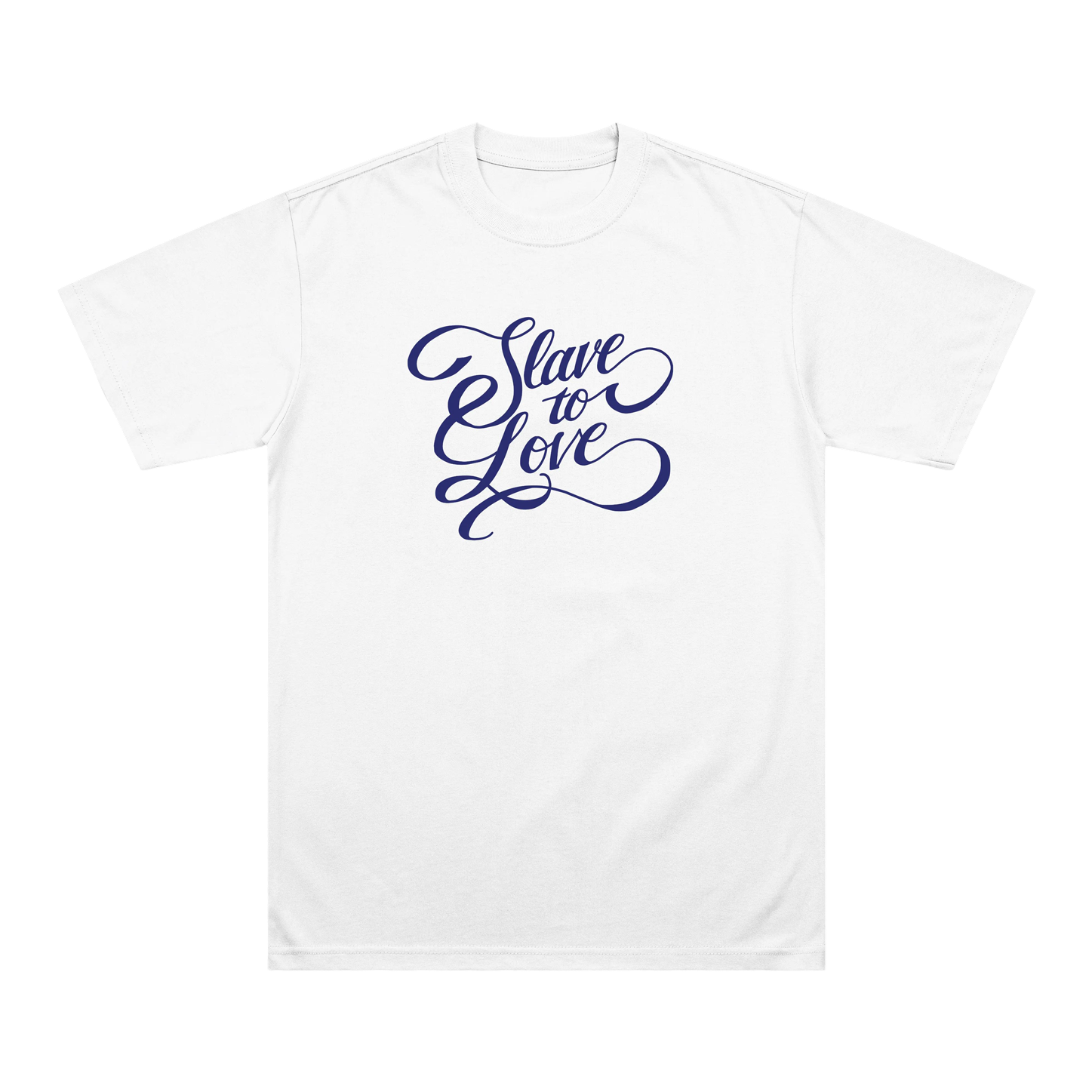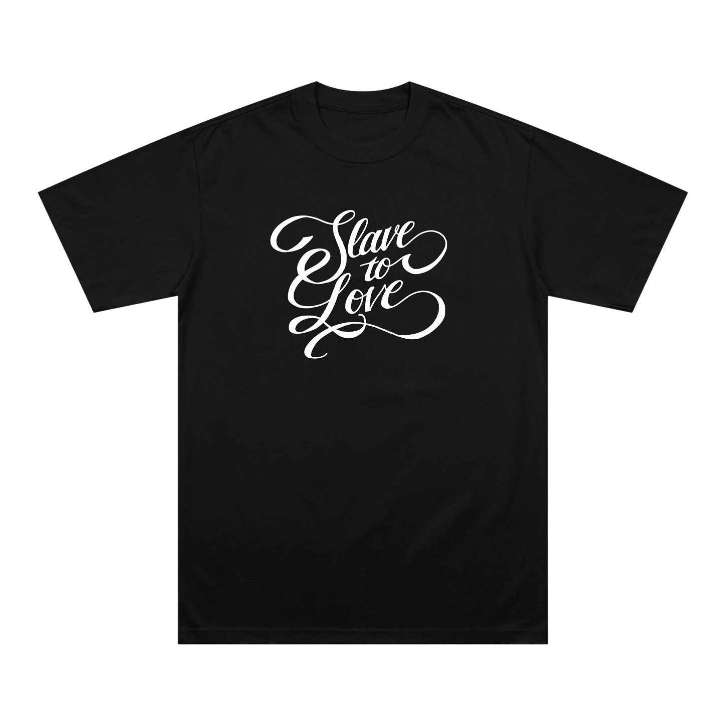 Official Slave To Love t-shirt, available in black and white, featuring graphic logo design on the front.